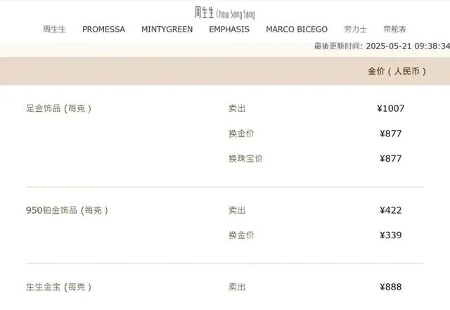 金饰品也跟进涨价。今天早上,部分品牌的金饰品价格再度来到千元。周生生调整足金饰品价格为1007元/克。