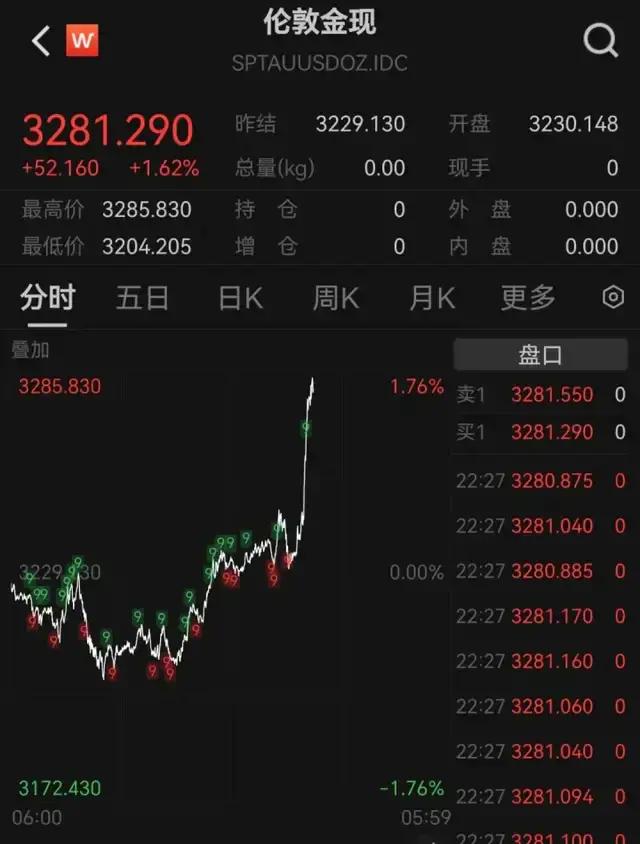 5月20日晚,现货黄金持续走高,突破3280美元/盎司,日内涨超1.6%。