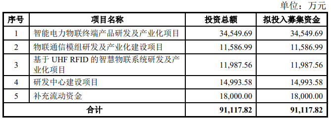 佳源科技原拟在深交所创业板募资91,117.82万元,用于智能电力物联终端产品研发及产业化项目、物联通信模组研发及产业化建设项目、基于UHFRFID的智慧物联系统研发及产业化项目、研发中心建设项目和补充流动资金。