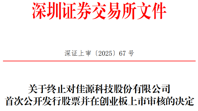 日前,佳源科技向深交所提交了《佳源科技股份有限公司关于撤回首次公开发行股票并在创业板上市申请文件的申请》,保荐人向深交所提交了《国泰海通证券股份有限公司关于撤销对佳源科技股份有限公司首次公开发行股票并在创业板上市保荐的申请》。根据《深圳证券交易所股票发行上市审核规则(2024年修订)》第六十二条的有关规定,深交所决定终止对佳源科技首次公开发行股票并在创业板上市的审核。