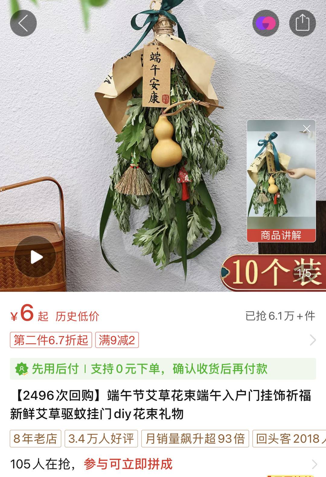 值得一提的是,还有不少商家售卖艾草挂件材料包,其中包含书法包装纸、香包、贺卡、葫芦、流苏等,消费者可以购买回家自己装饰艾草。这种材料包单个售价在5元左右。销量也非常高,其中有店铺销量已超6万单。
