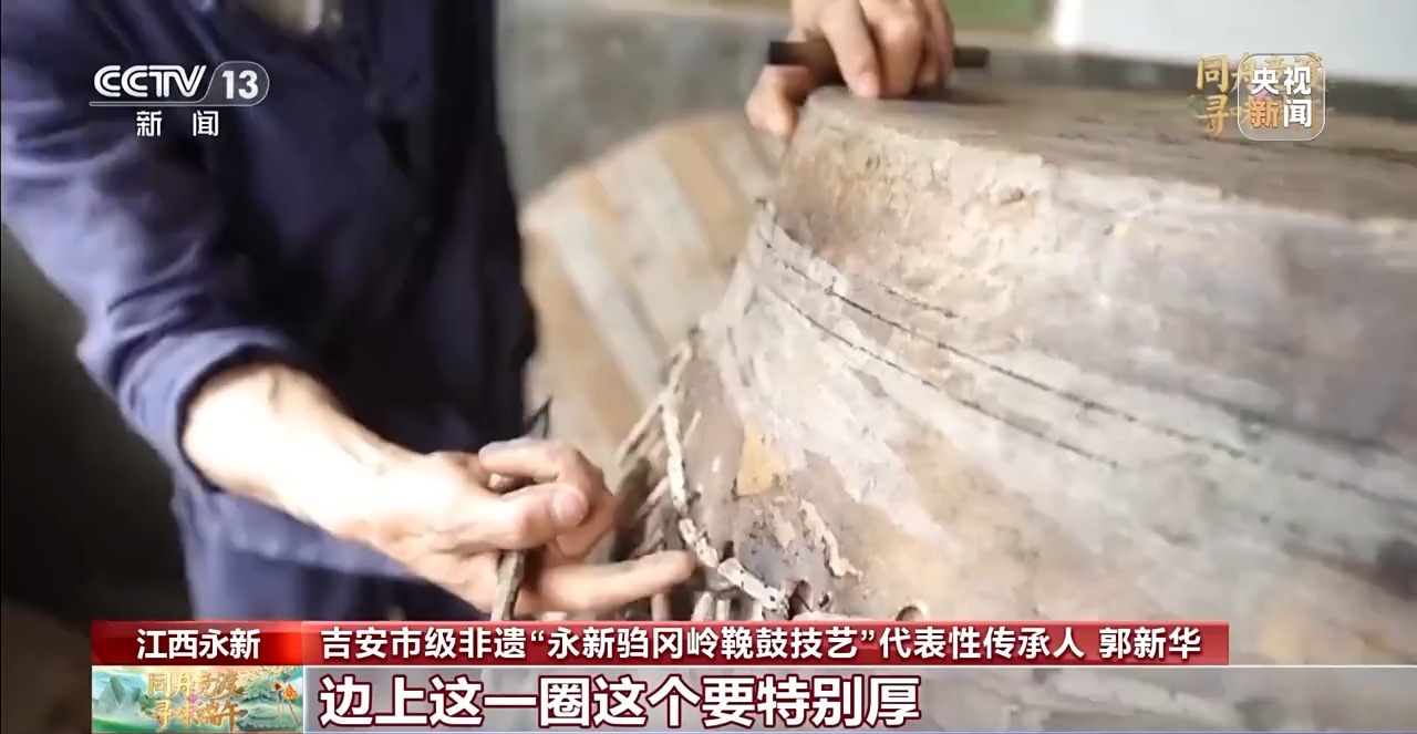 吉安市级非遗“永新驺冈岭鞔鼓技艺”代表性传承人郭新华:这里凹下去了,这里鼓起来了,把这里刨掉,刨的时候整体这个圆就出来了。