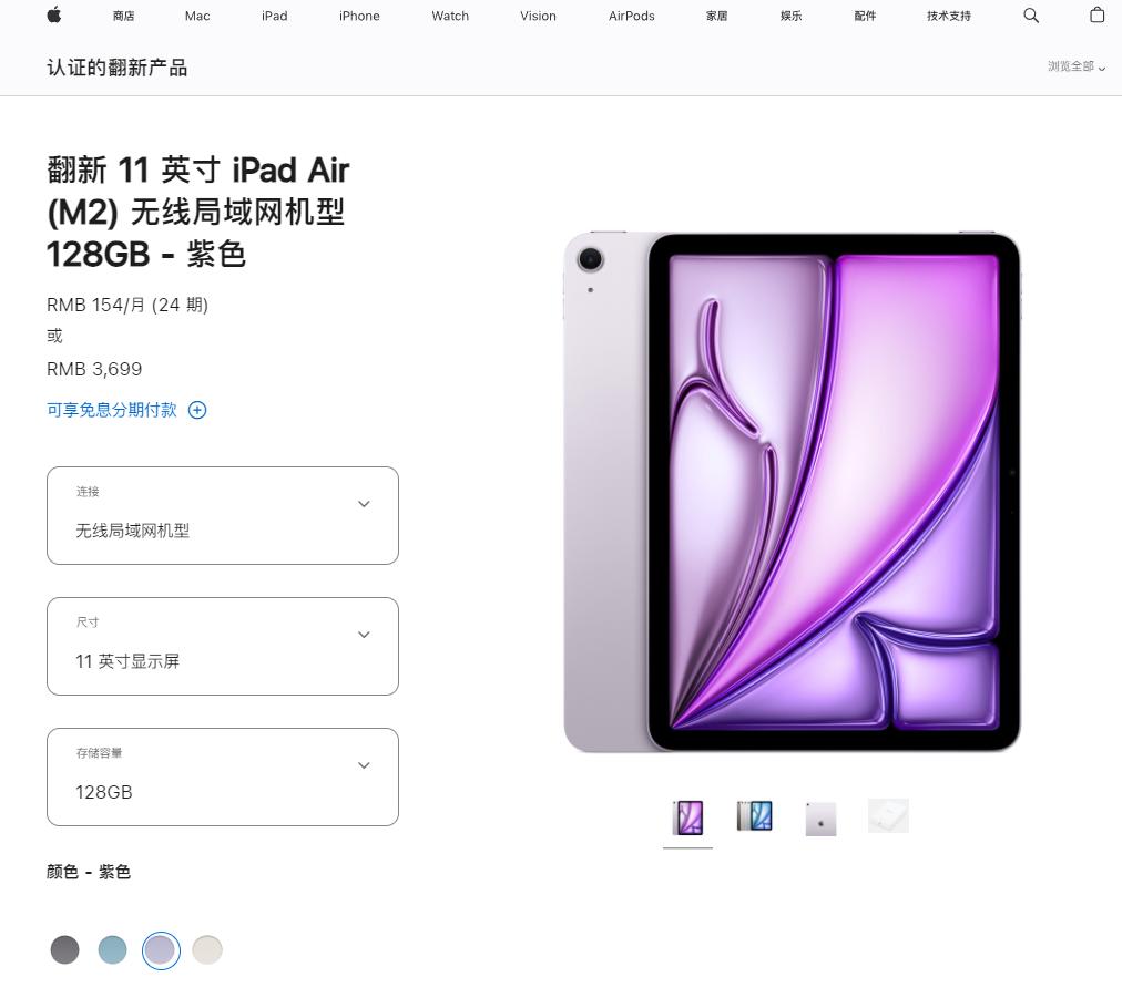 截至发稿时,苹果翻新的 M2 iPad Air 提供多种颜色和容量选择,包括支持蜂窝网络和标准 Wi-Fi 的机型。不过,由于苹果会定期更新库存,因此产品供应情况可能会随时间变化。如果消费者对特定颜色或容量有需求,可能需要定期查看库存情况。