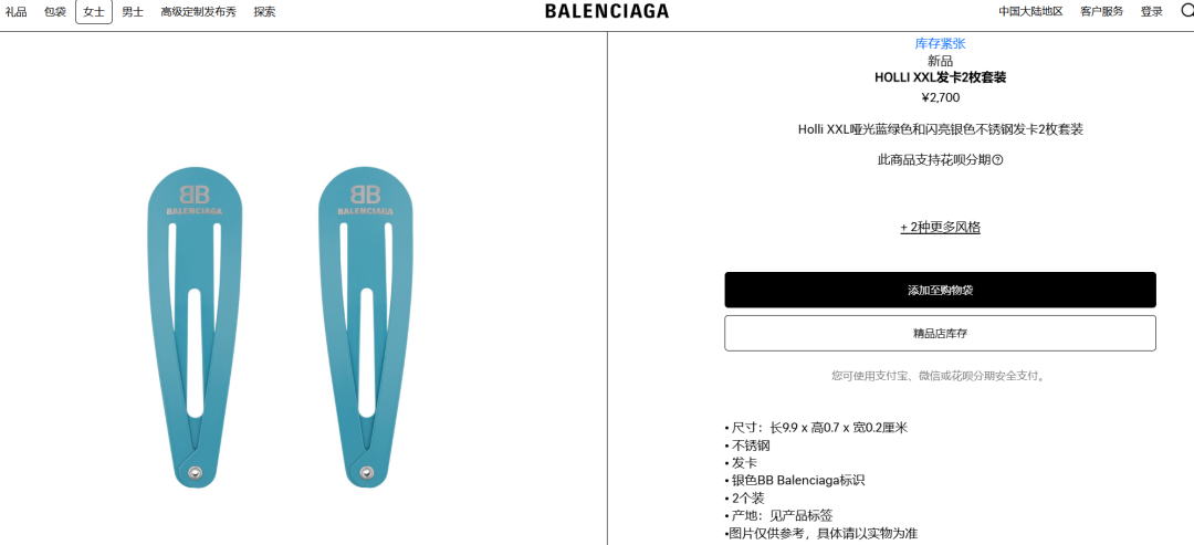 官网介绍称,该款发卡尺寸长9.9cm、高0.7cm、宽0.2cm,材质为不锈钢,上面印有“BB Balenciaga标识”。