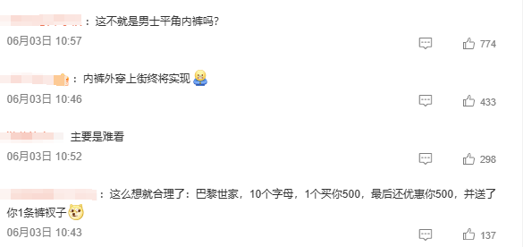 该设计也引发网友吐槽——有网友评论称:“这不就是男士平角内裤吗?”“真不是为了偷懒吗?”“这玩意儿居然还要4500一条?”甚至有网友称“感觉有点恶俗”……