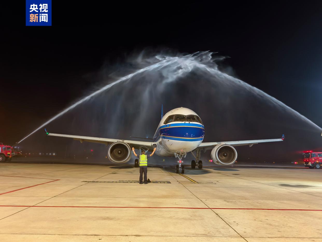 △当地以象征民航最高礼仪的“水门礼”,迎接国产大飞机C919的首次到来。