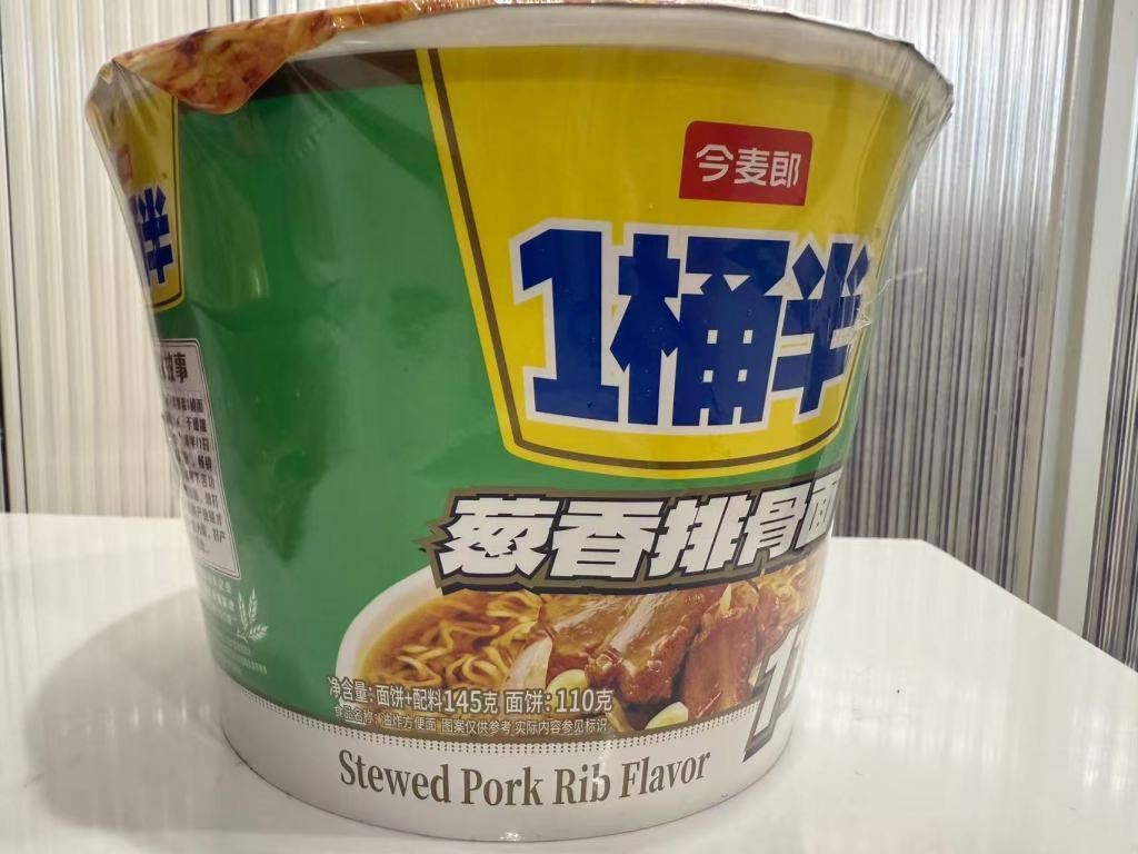 热销的今麦郎 “1 桶半” 桶装方便面面饼标注的克数为 110g,产品外包装上注明:“不是两桶买不起,而是1桶半更有性价比:与今麦郎弹面小桶产品对比” 等字样。