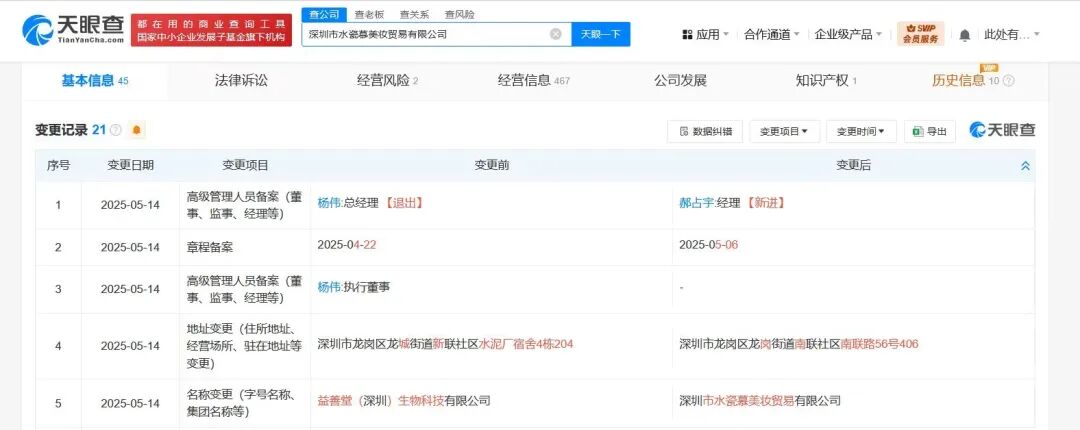值得注意的是,5月14日,黄杨钿甜父亲杨伟卸任深圳市水瓷慕美妆贸易有限公司(曾用名:益善堂(深圳)生物科技有限公司)法定代表人、执行董事、总经理并退出股东行列,同时司玲霞卸任监事。近日,该公司因通过登记的住所或者经营场所无法联系,被深圳市市场监督管理局龙岗监管局列入经营异常名录。