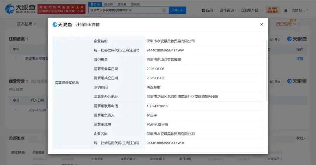 天眼查App显示,近日,深圳市水瓷慕美妆贸易有限公司新增一则注销备案公告,公告期自6月6日至7月21日,注销原因为决议解散。该公司成立于2020年4月,法定代表人为郝占宇,注册资本1000万人民币,经营范围含生物工程技术的开发、咨询及销售,护肤品、化妆品、美容用品、卫生用品、纺织品、针织品、服装、眼镜的零售与批发,生物制品技术开发等。
