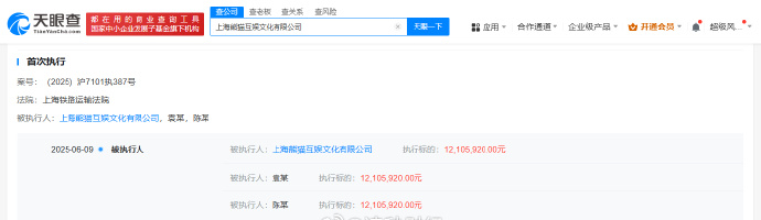 天眼查App显示,上海熊猫互娱文化有限公司、袁某某、陈某新增一条被执行人信息,执行标的1210万余元,涉及合同纠纷相关案件,执行法院为上海铁路运输法院。