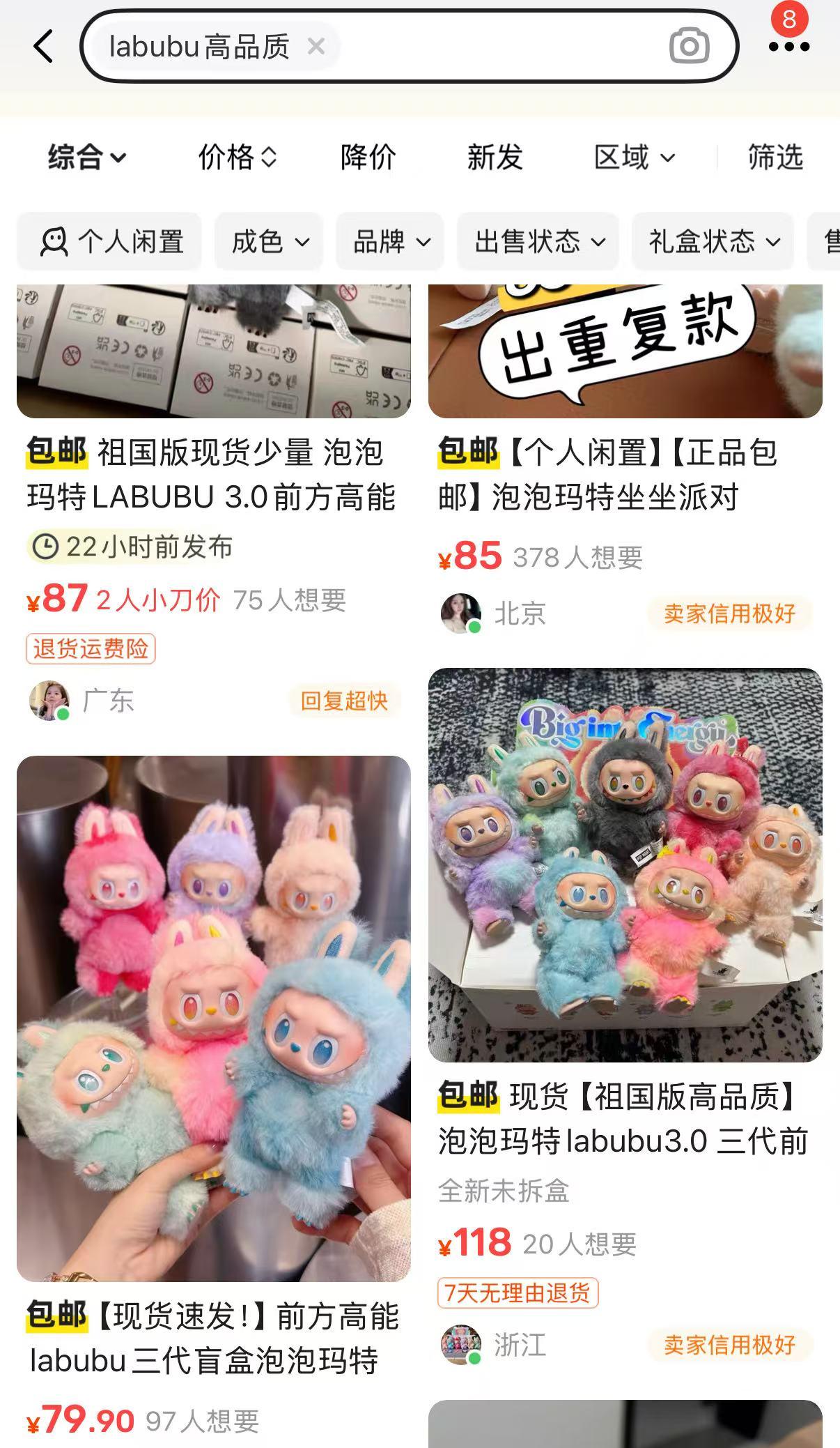 此外,也有不少消费者在电商平台以低价购入“Lafufu”。“Lafufu”做工粗糙,存在脸不对称、手装反、四肢无法灵活活动等问题,但仍有消费者特意购买。有人因正品难买而选择盗版,也有人因觉得其丑得有趣而入手。尽管“Lafufu”是盗版,却意外推动了正品“Labubu”的需求。