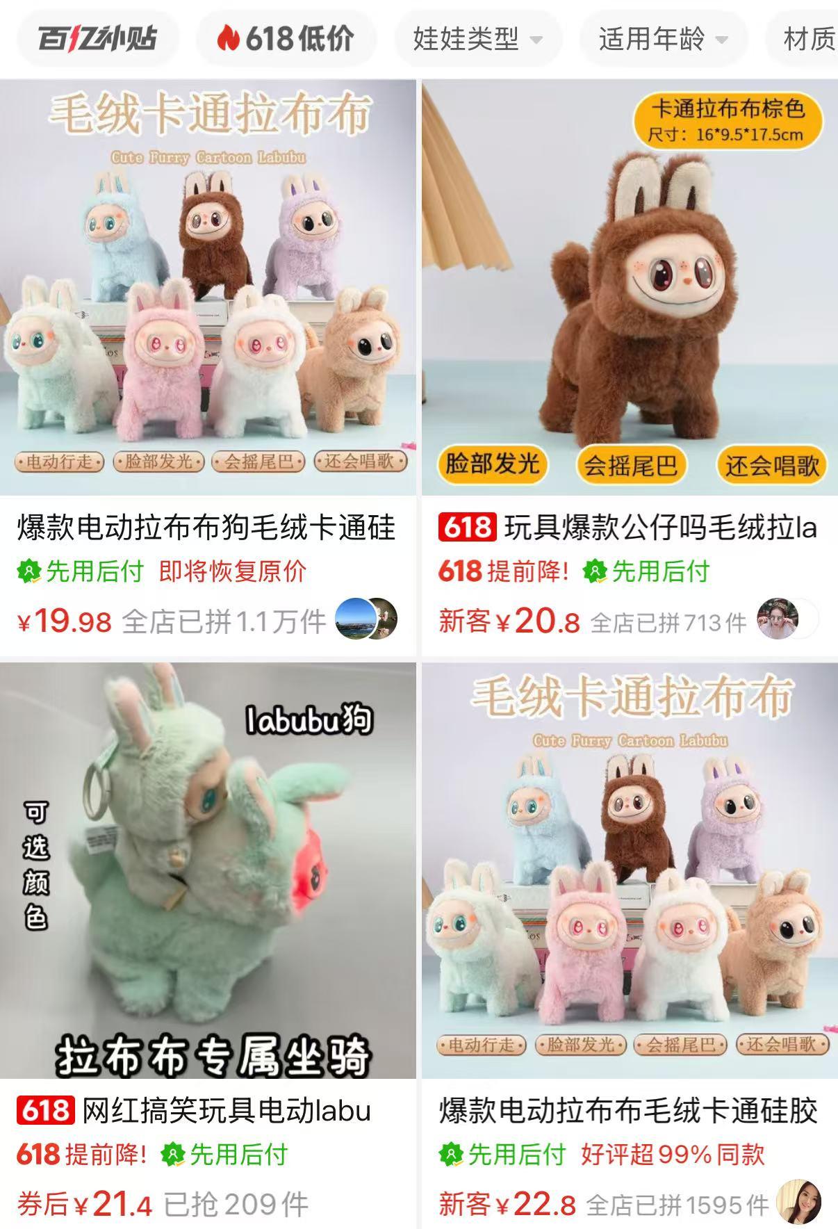 另一种是价格相对便宜的 “义乌高品质” 款,与原版差距较大,价格相对便宜,社交平台上网友们称其为“Lababa”“Lagogo”。其中,“Lagogo”是四脚着地的电子狗形态,可以行走,还会摇尾巴、唱歌,有商家已经售出了上万个。相比高仿品,“义乌高品质” 款的售价相对较低,价格区间在二三十元左右。
