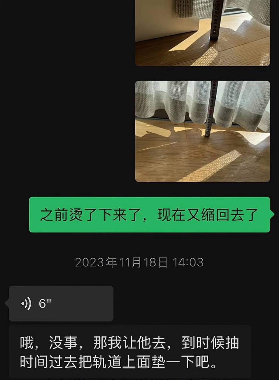 “铝板退了1500元。地砖替换了3块,另外3块上边已经安装了柜子,替换的话要拆除柜子。木地板厂家来看,说是出厂的时候少了一道工序,给我补刷进口木蜡漆。结果,刷完漆地板变色了,大量的节疤在变色后全成深黑色,非常丑。”蔡先生说,更让他哭笑不得的是,大几百元一米的窗帘全部是拼接的,并且距离地面超过6厘米,店家让他“烫熨一下,往下拉一下就齐地了”。在他一再要求下店家进行了整改,结果是将窗帘轨道拆下,往下移了几厘米,用裸露的螺钉固定在天花板上。