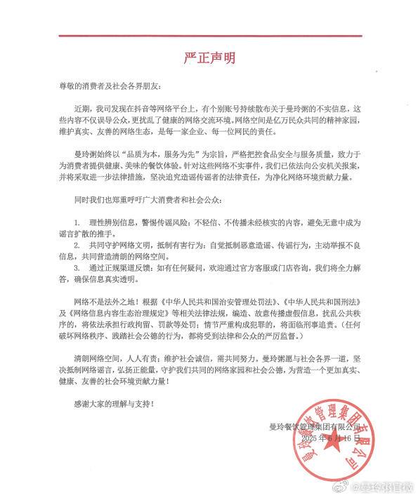 6月16日中午,@曼玲粥官微 发布严正声明,全文如下: