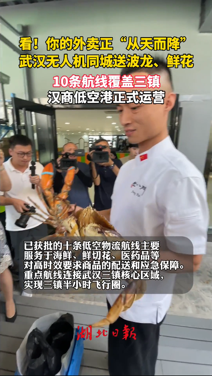 湖北日报讯(记者刘柳、肖丽琼)6月16日上午11时18分,载有波士顿龙虾的无人机精准降落在汉商21世纪购物中心楼顶停机位,标志着飞行服务航线覆盖武汉三镇的汉商低空港正式投入运营。