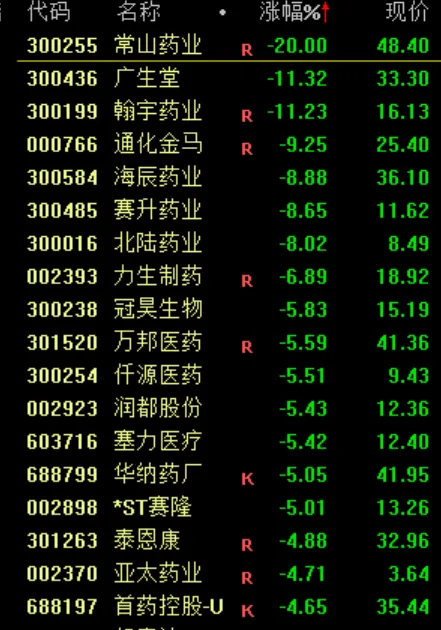 下跌方面,创新药概念股走低,常山药业20cm跌停。