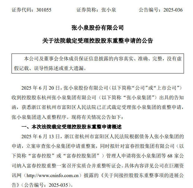 据公告,6月13日,富阳区人民法院根据债务人张小泉集团的申请,立案审查张小泉集团申请重整案,同时拟针对富春控股集团有限公司管理人申请将张小泉集团等68家公司纳入富春控股重整一案召开实质合并重整听证会。