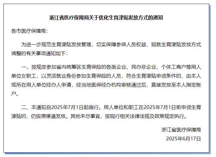 记者从浙江省医保局了解到:近日,浙江省医疗保障局印发《关于优化生育津贴发放方式的通知》,7月1日起施行。优化后,生育津贴直接发放至本人指定账户。