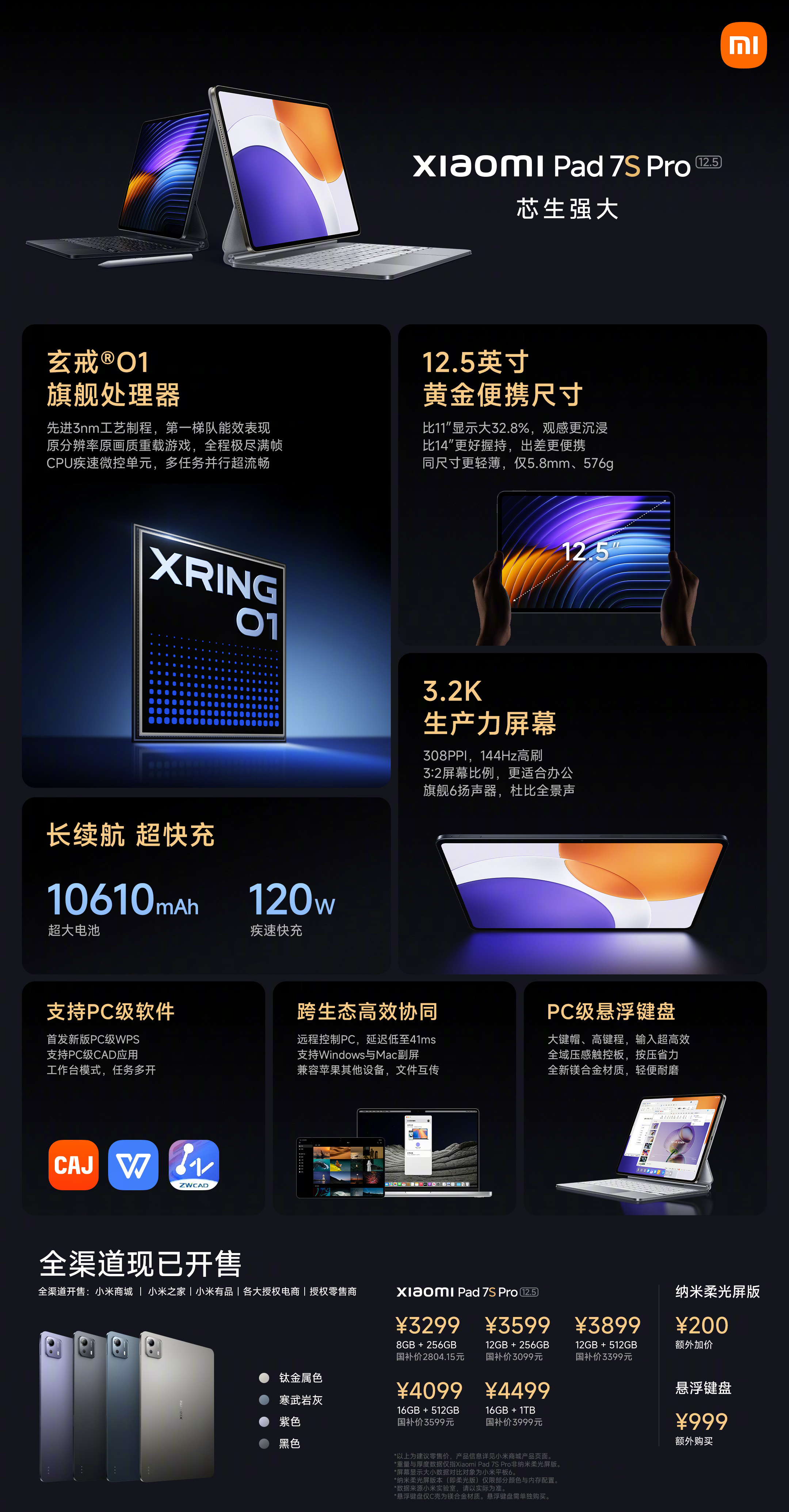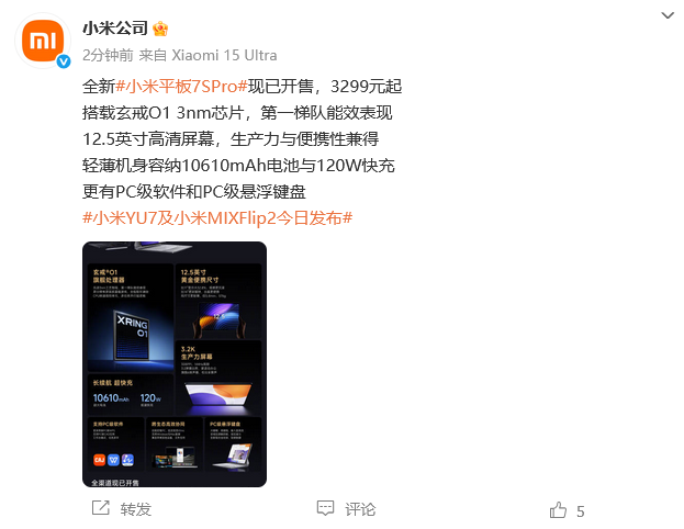 6月26日晚,据 @小米公司 发布,全新小米平板7SPro现已开售,3299元起: