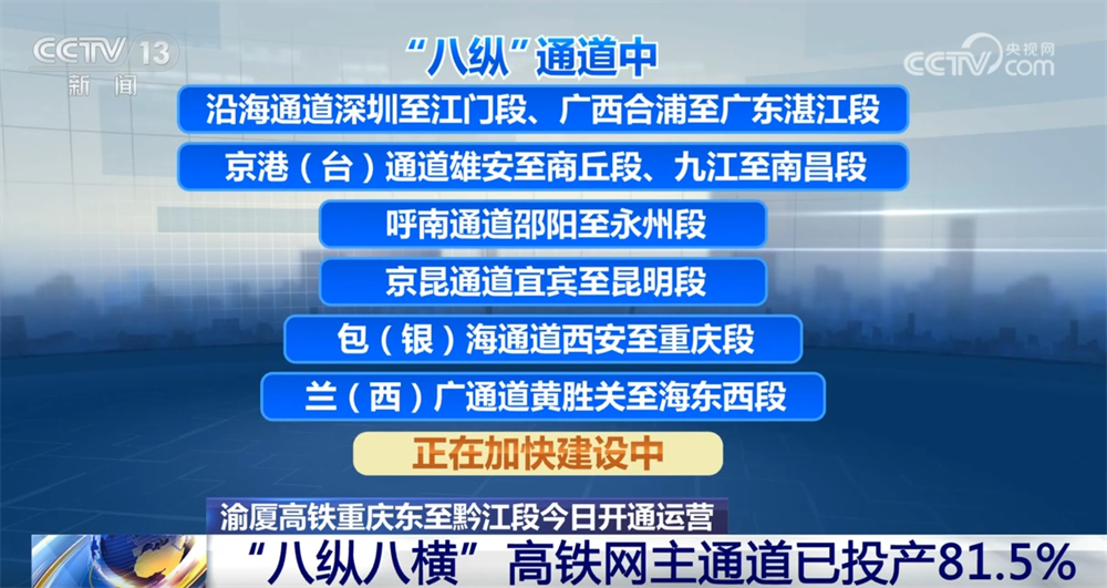“八纵”通道中沿海通道深圳至江门段、广西合浦至广东湛江段、京港(台)通道雄安至商丘段、九江至南昌段、呼南通道邵阳至永州段、京昆通道宜宾至昆明段、包(银)海通道西安至重庆段、兰(西)广通道黄胜关至海东西段正在加快建设中,包(银)海通道延安至西安段预计年内通车。“八横”通道中沿江通道成都至达州至万州高速铁路正在建设,京兰通道包头至惠农段、沿江通道武汉至宜昌段预计年内通车。