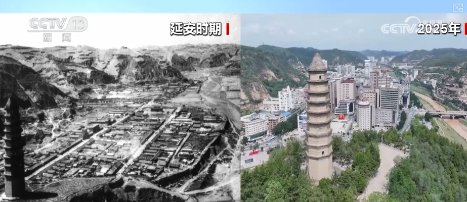 提起延安,很多人自然就会想到巍巍宝塔山。这张照片拍摄于80多年前的宝塔山上,当时,城里大多是低矮的平房。如今从同一个位置俯瞰,这里已经发生了翻天覆地的巨变。延河两岸,高楼大厦拔地而起,鳞次栉比的现代化新城矗立眼前。