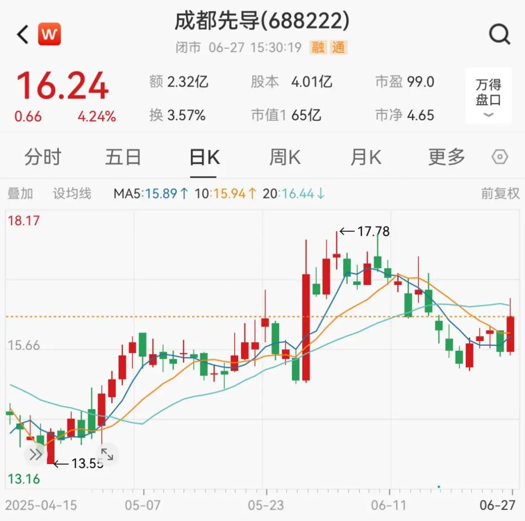 二级市场上,截至6月27日收盘,成都先导上涨4.24%,报收于16.24元/股,最新市值为65亿元。