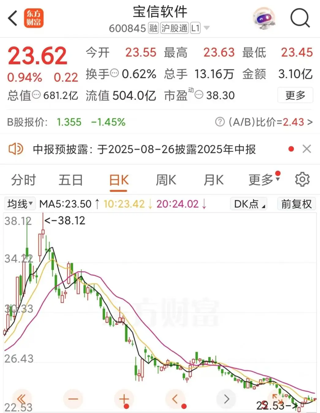 截至6月30日,宝信软件股价收于23.62元/股,总市值为681.2亿元。