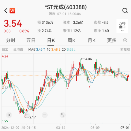 截至7月1日收盘,*ST元成股价报3.54元/股,总市值为12亿元。