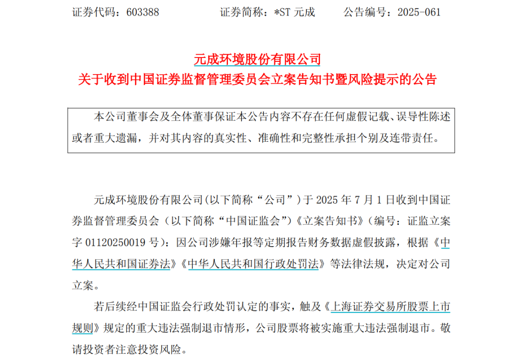 7月1日,*ST元成发布公告称,因公司涉嫌年报等定期报告财务数据虚假披露,根据《中华人民共和国证券法》《中华人民共和国行政处罚法》等法律法规,中国证监会决定对公司及公司控股股东、实际控制人祝昌人立案。