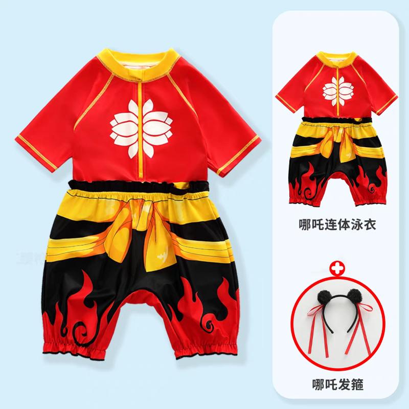 除了孙悟空,今年大火的哪吒也成为泳衣的设计元素。记者在某网购平台看到一款哪吒连体泳衣,泳衣上的图案有莲花、风火轮等元素。商家还搭配销售乾坤圈、红缨枪和发箍。综合价格来看,普遍在50元左右。