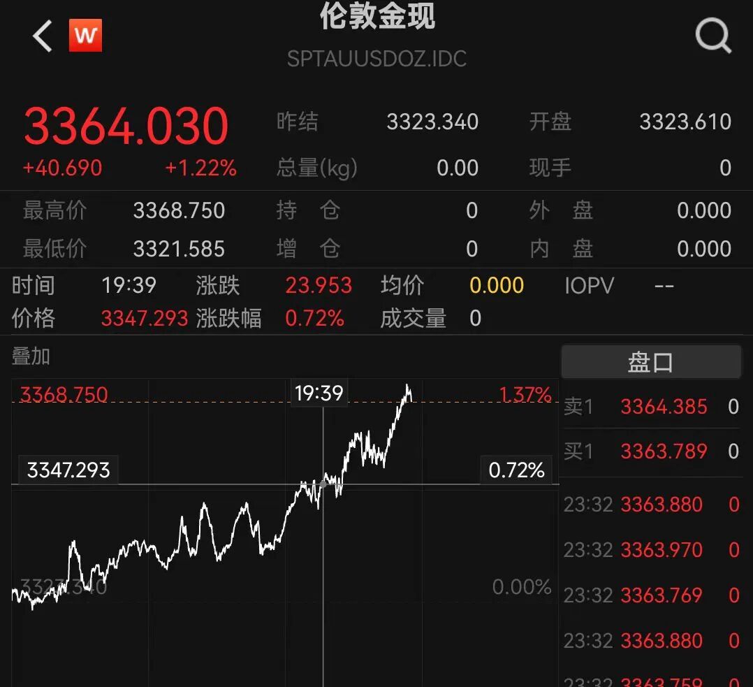 贵金属行情爆发,黄金、白银明显上涨,截至发稿,现货黄金涨超1%,站上3364美元/盎司。