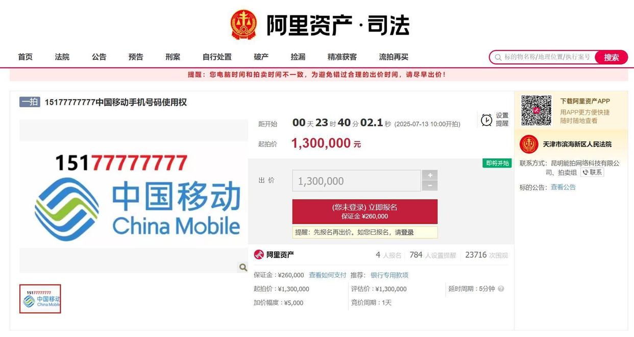 阿里拍卖平台显示,该手机号起拍价为130万元,保证金高达26万元,加价幅度为5000元,拍卖时间为7月13日10时至2025年7月14日10时止(延时除外)。