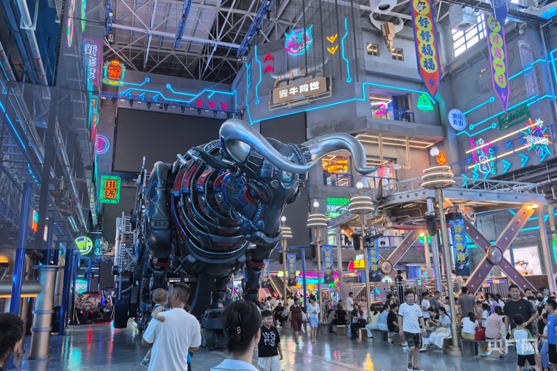 炎炎暑期,淮北夔牛天街内人头攒动,众多家长和孩子排起了长队,一场 “雷霆之舞” 表演即将启幕。高达10余米的机械夔牛 “雷雷” 伴着炫目灯光 “起舞”,数百个精密机械部件构成动态演绎系统,与灯光秀、主题游乐设施、餐饮空间、文创小店,形成演绎 ― 观赏 ― 消费闭环场景。