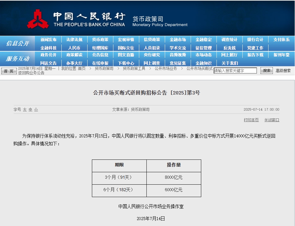 中国人民银行7月14日发布公告称,为保持银行体系流动性充裕,2025年7月15日,中国人民银行将以固定数量、利率招标、多重价位中标方式开展14000亿元买断式逆回购操作。