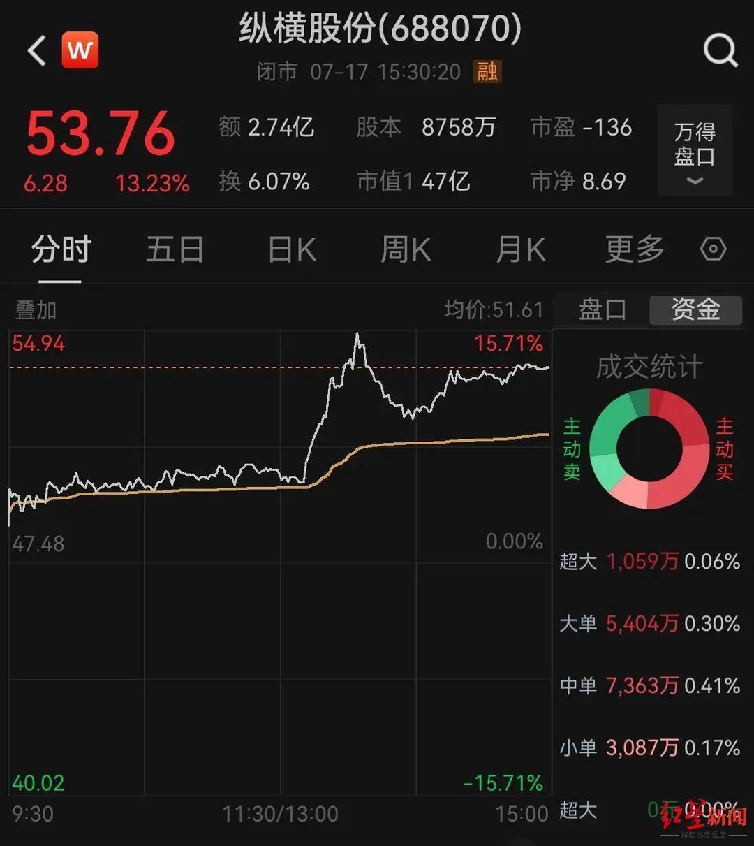 不过,在本次离婚纠纷上诉期间,纵横股份持续走高,累计涨幅达52%。按7月17日纵横股份收盘价53.76元/股计算,999.6万股股份的对应市值达到5.37亿元。