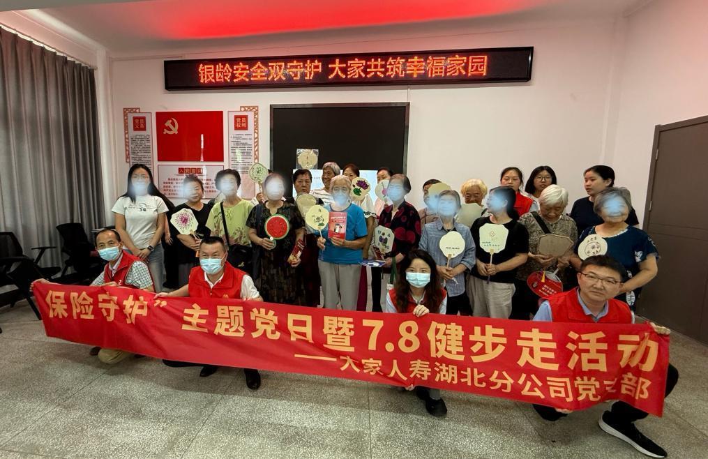 2025年7月17日,大家人寿湖北分公司党支部组织党员、入党积极分子冒着酷暑,走进武汉市洪山区五环社区党员群众服务中心,以“健步走+金融教育”的形式,为社区老年居民送上了一堂生动实用的反诈“必修课”,将党建活力转化为服务群众的实际行动。