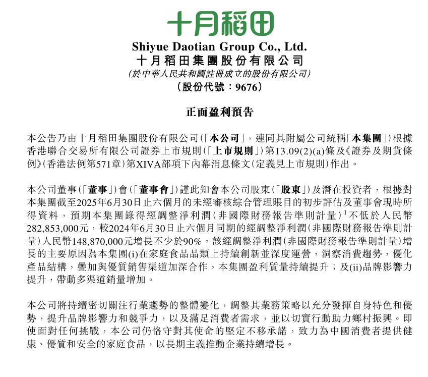 在这一消费驱动型增长模式下,食品行业作为民生消费的重要领域,也迎来新一轮的发展机遇。其中,家庭食品创新品牌十月稻田表现不俗。7月17日,十月稻田发布2025 年半年度盈利预告,预期集团上半年经调整净利润不低于约人民币2.83亿元,较上年同期的经调整净利润约人民币1.49亿元增长不少于90%。业绩大幅上涨背后,十月稻田的增长逻辑值得深入探究。