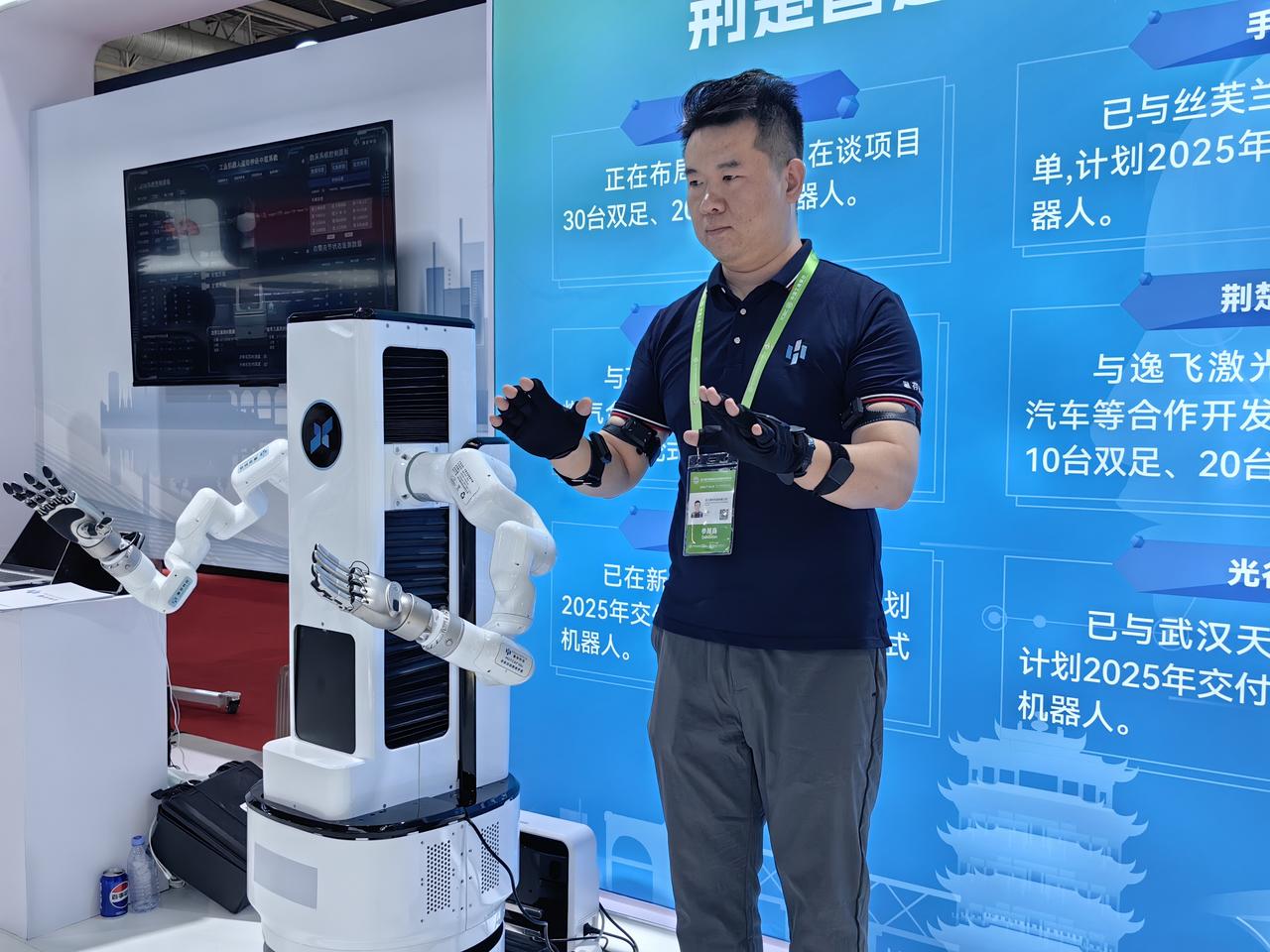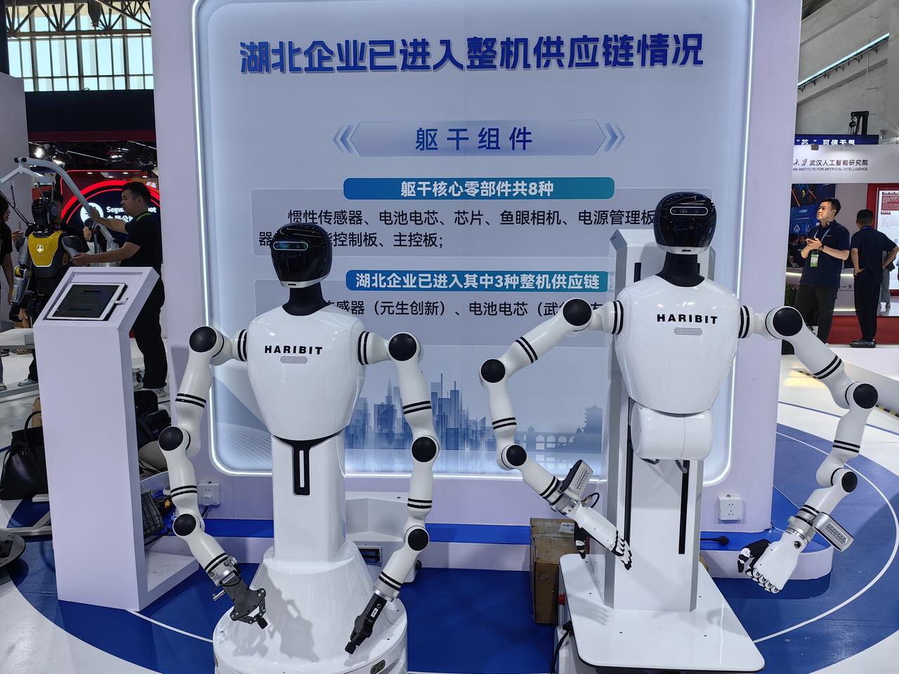 在湖北人形机器人产业链专业展区,武汉格蓝若自研的机器人大壮和小壮、光谷东智具身智能技术有限公司发布的整机新品“光子”、湖北荆楚人形机器人有限公司的荆楚1号、湖北铠瑞博科技有限发展有限公司的智能养老机器人、武汉灏存科技有限公司带来的工业数采机器人……各自大放异彩,各显神通,让中外观众见识到人形机器人的不同应用场景可能。