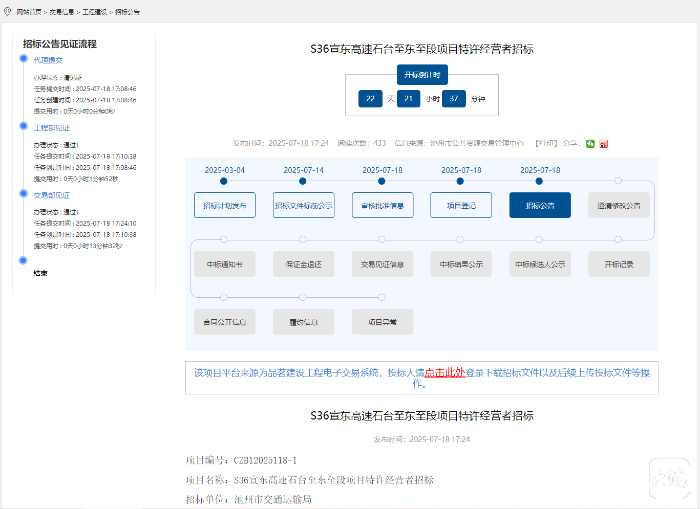 公告显示,该项目特许经营期限不超过408个月(34年),分“准备期及建设期”和“运营期”两个项目阶段,其中,准备期自特许经营协议签订之日起至项目开工令(通知)载明的开工之日止,不超过12个月(1年);建设期满足计划36个月(3年)的工期目标。运营期自交工验收合格日起至项目移交日止。其中,收费期限不超过360个月(30年),实际以省级人民政府批复为准。
