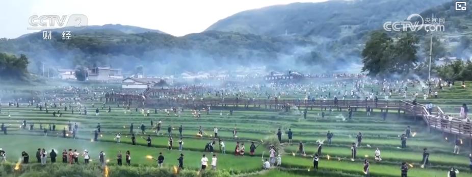 在越西县,夏季避暑暨火把季系列活动也轮番上演。除了有精美绝伦的非遗巡游,和极具视觉冲击力的彝族传统竞技,在越西县普雄镇阳坡村的梯田上,一场原生态稻田火把秀更是吸引数以千计的游客前来。大家跟随当地居民在稻田间点燃火把,用火焰驱逐害虫。游客们手中的火把与稻田连成一片,场面蔚为壮观。