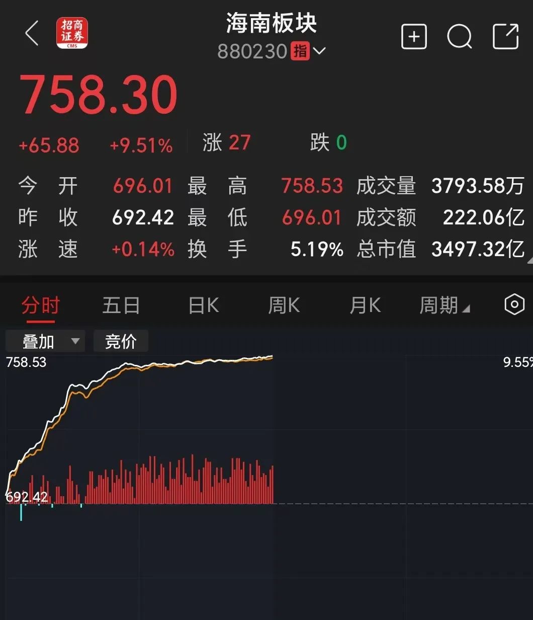 今天(7月24日)上午A股市场整体上行,海南板块全线爆发,成为上午市场最大亮点之一。