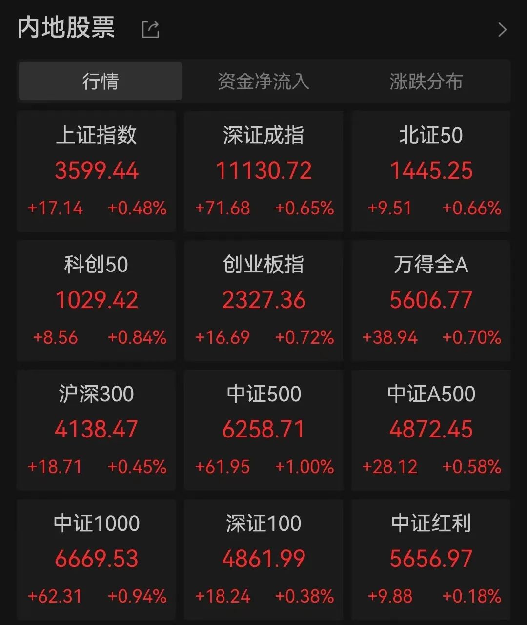 7月24日上午,A股市场整体上行。截至中午收盘,上证指数上涨0.48%,报3599.44点;深证成指上涨0.65%,创业板指上涨0.72%。