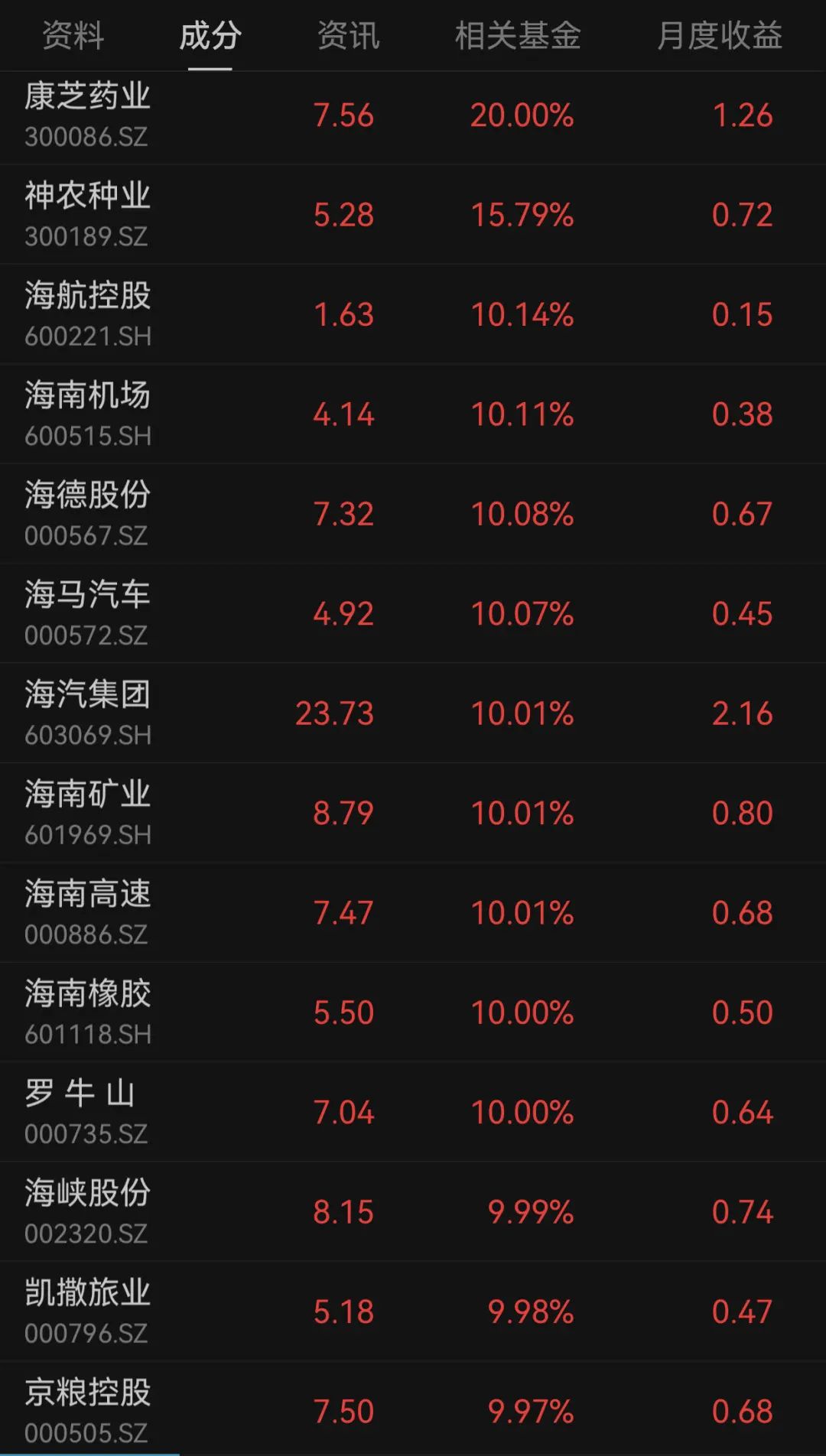 地区板块方面,海南板块今天上午暴涨,截至中午收盘,板块涨幅超过9%。个股方面,康芝药业20%涨停,海南机场、海航控股、海马汽车、海南高速、海汽集团等十多股盘中亦涨停。