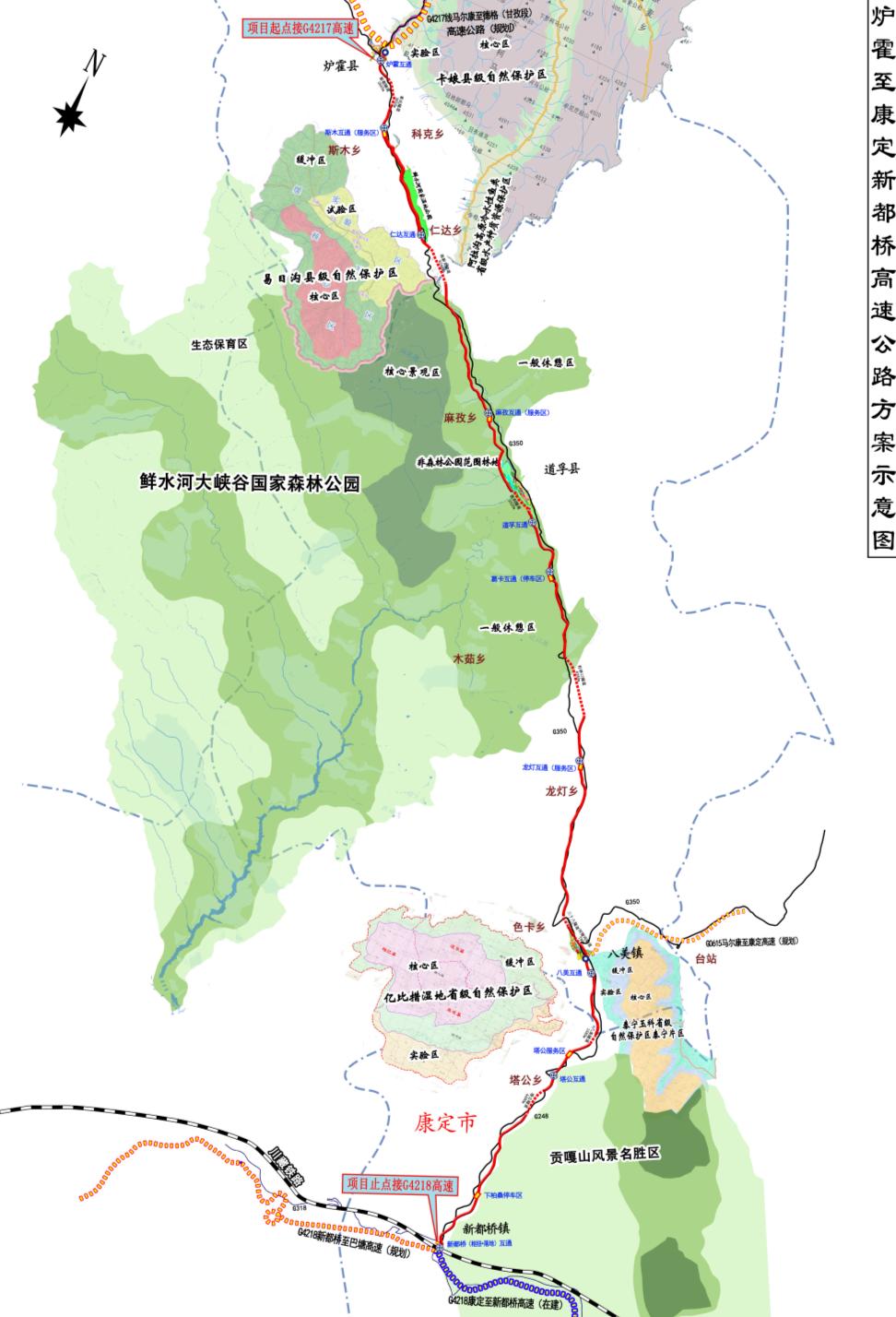 路线起于炉霍县新都镇,接规划待建G4217马尔康至德格段高速公路,经道孚县,止于康定市新都桥镇,接在建的G4218线康定至新都桥段高速公路。项目全长185.53公里,估算总投资344.17亿元,全线采用设计速度80公里/小时、双向4车道高速公路技术标准,建设工期4年。其中,仁达互通至道孚互通段约42.63公里路基宽度22.5米,其余路段25.5米。