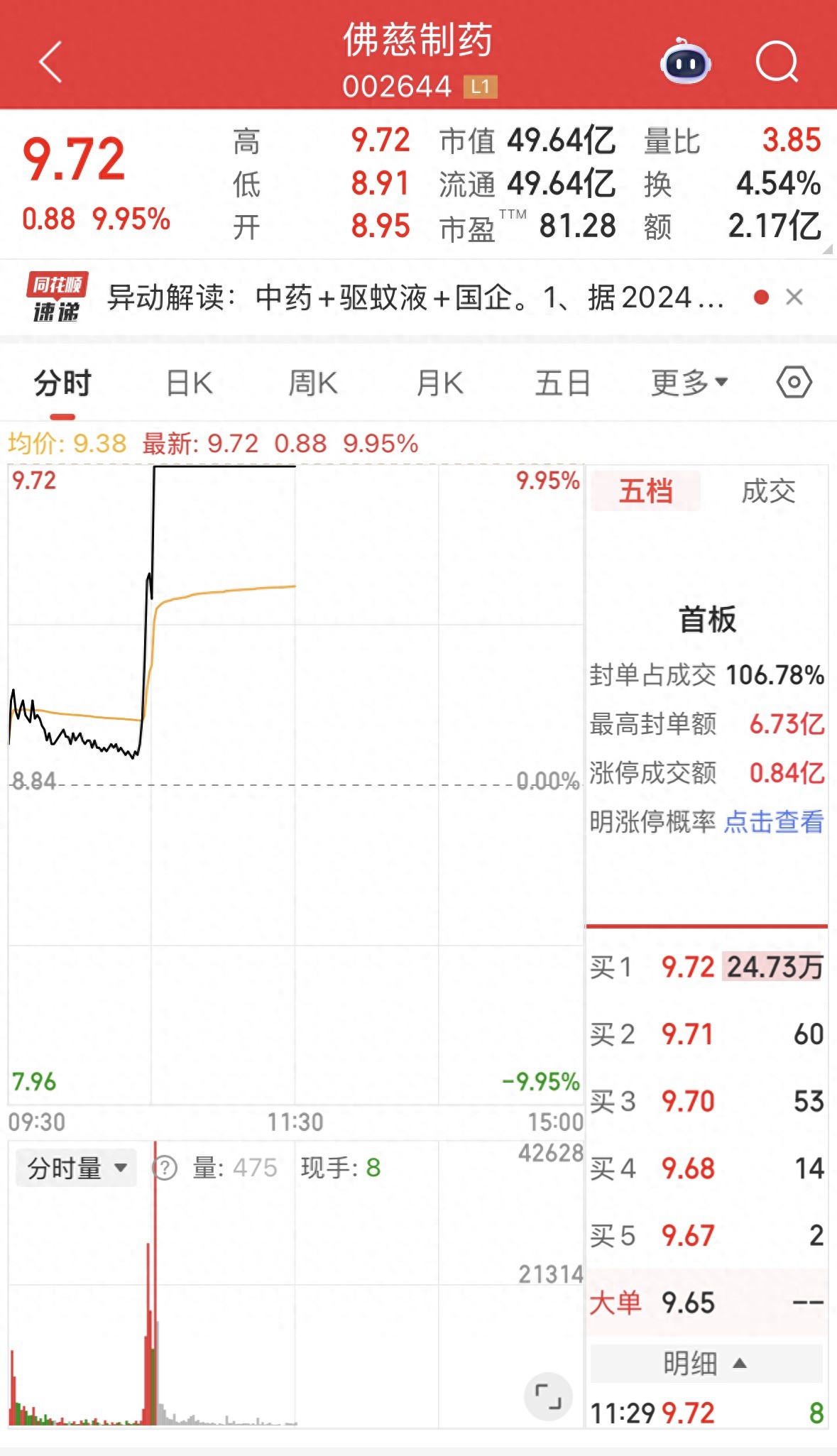 7月28日早间,佛慈制药突现异动,股价直线拉升,不过十分钟便触及涨停,盘中封单金额一度高达6.73亿元。截至午间收盘,涨停板牢牢封死,封单金额仍超过2亿元。