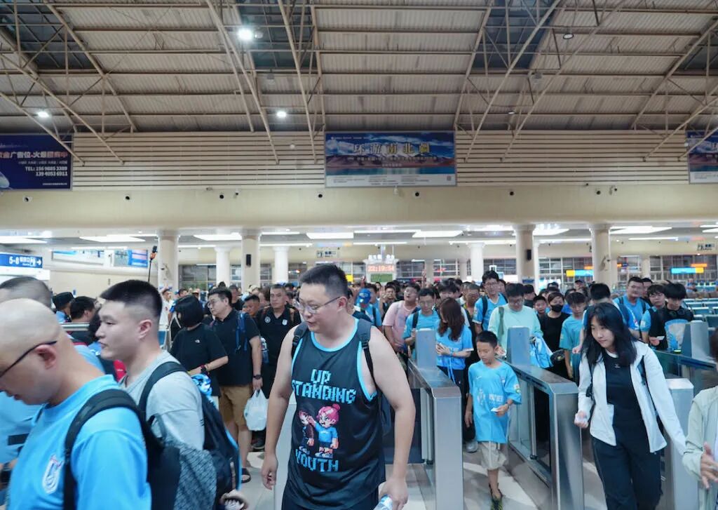 7月26日22时,大连站候车室已成为一片“蓝色海洋”。大连站制订专项方案,设置绿色通道,提供进站安检、专区候车等专人引导服务,方便球迷旅客及时、顺利乘车。
