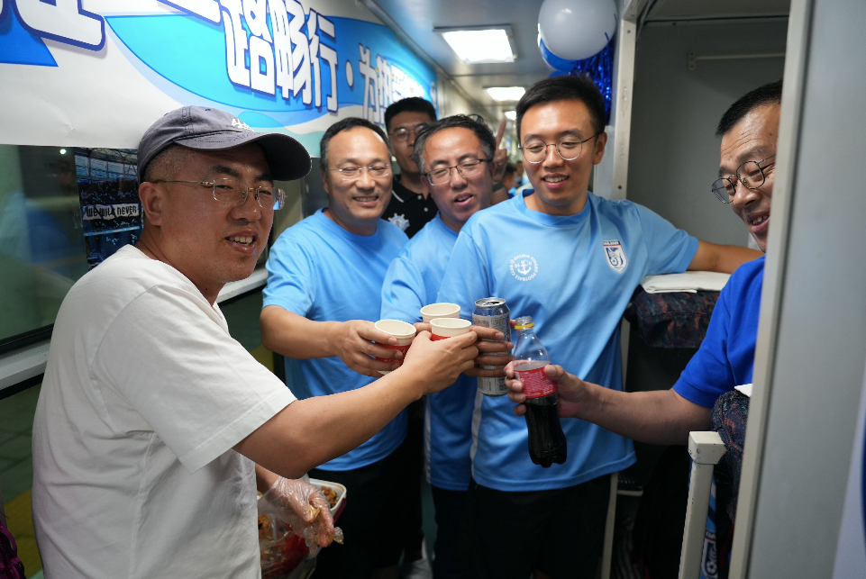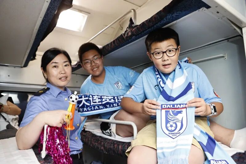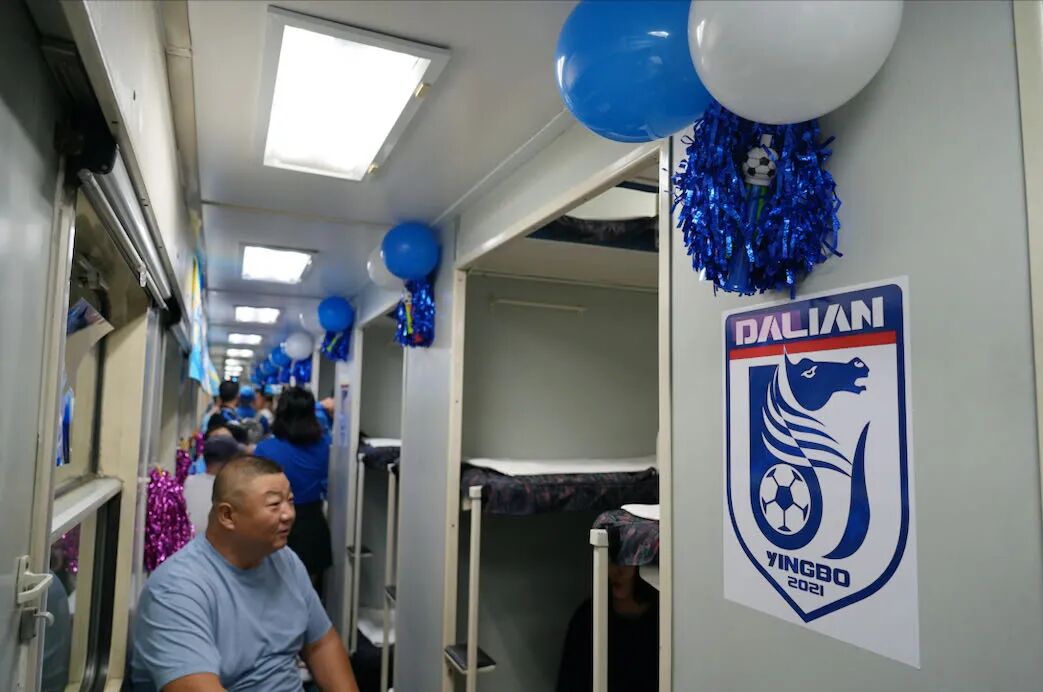 发车前,担当本次乘务工作的大连客运段工作人员精心布置车厢,对车窗、车门进行了装饰,悬挂了带有球队标志、赛事主题的旗帜和海报,让整个车厢洋溢着浓厚的观赛氛围。