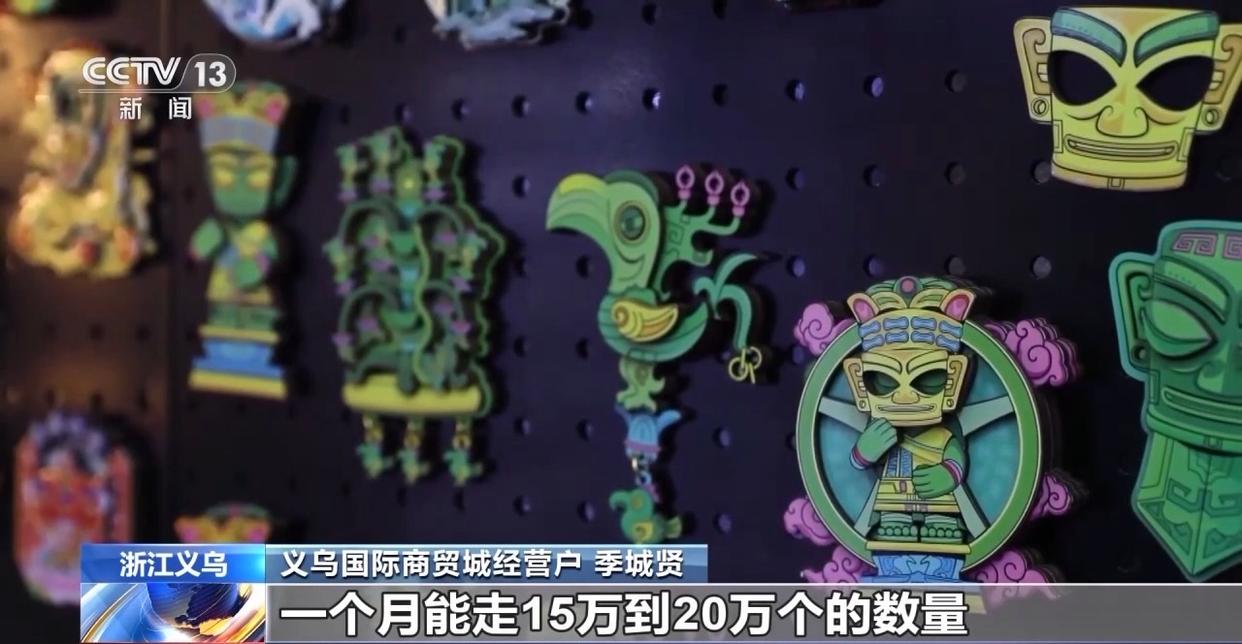 义乌国际商贸城经营户季城贤:像三星堆冰箱贴加了银箔材质,让它的金属质感更强。增加了互动性,比如说三星堆的黄金面具,把它设计成可活动的。目前量大的时候,一个月能走15万到20万个的数量。