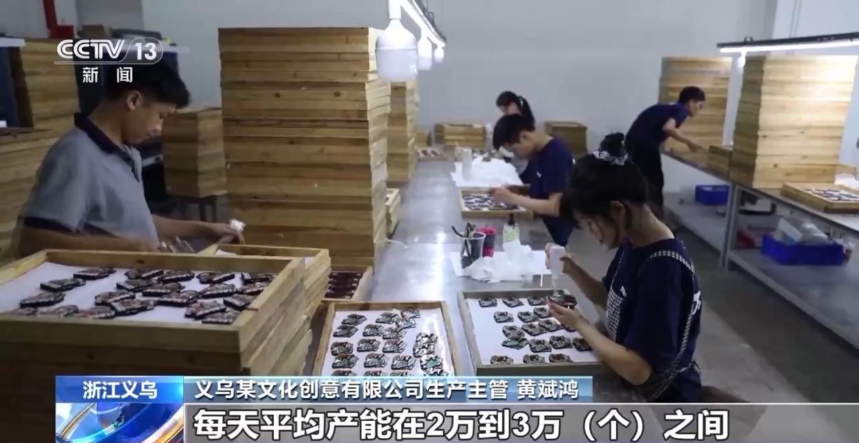 义乌某文化创意有限公司生产主管黄斌鸿:目前,我们订单量已经排到9月份了,员工现在也都是满负荷在做,每天平均产能在2万到3万个之间。