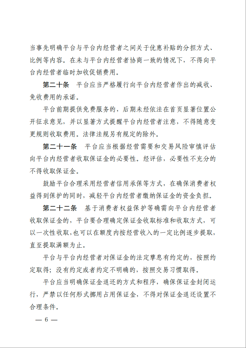 《指南》规定平台不得向平台内经营者重复收费,不得只收费不服务、少服务,不得转嫁应当由平台自身承担的费用,不得向平台内经营者收取提供其基础经营数据的费用,不得强制或者变相强制平台内经营者购买服务或者参加推广、促销活动并收费,不得利用不合理的保证金等形式变相收费或者提高收费标准,不得对具有同等交易条件的平台内经营者实行价格歧视等。